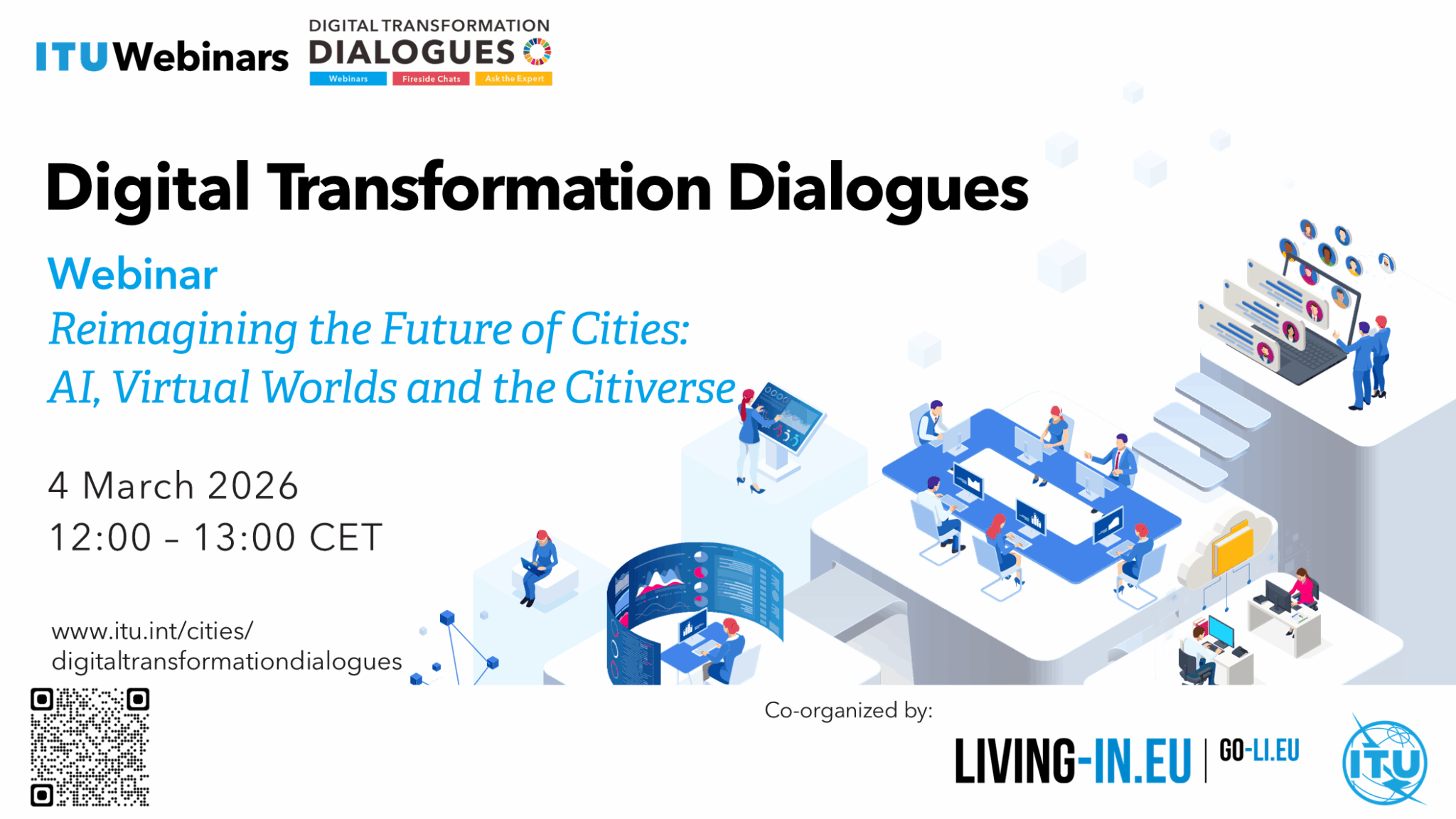 This webinar, held as part of the ITU Digital Transformation Dialogues and co-organized by the International Telecommunication Union (ITU), and the Education and Capacity Building Working Group of Living-in.EU, will introduce the citiverse concept to city administrations, public authorities, and digital innovation stakeholders, including the Living-in.EU community. It will provide an overview of the citiverse vision, its defining characteristics, and its potential value for cities and communities. It will highlight how the citiverse goes beyond existing digital tools by enabling more immersive, participatory, and people-centred approaches to cities’ digital transformation.